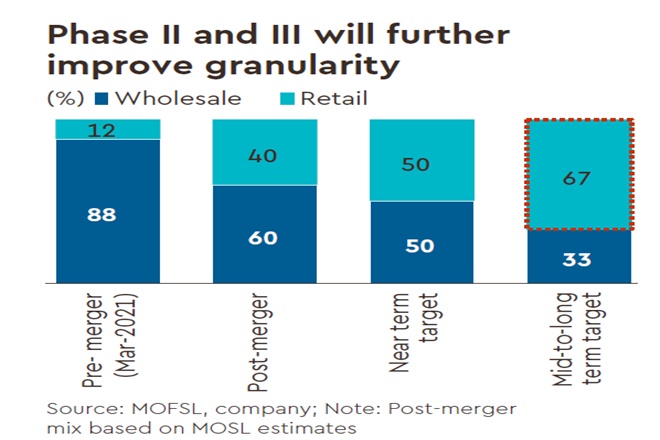 Post-merger, the Retail loan book will be 5x of PIEL’s current Retail loans and the retail-to-wholesale mix will be 40:60 (MOSL estimate). Mgmt said it will improve this mix to 50:50 in the near-term (within one-year) and 67:33 over the mid-to-longer term. This will lead to a significant improvement in distribution footprint, customer franchise, and liability profile. While Phase I (consolidation) was a ‘trust me’ story, Phase II and III in PIEL’s transformation agenda has to be a ‘show me’ story, where PCHFL will have to scale up DHFL’s mortgage franchise and leverage the platform to effectively cross-sell its other organic Retail products to the customer pool.