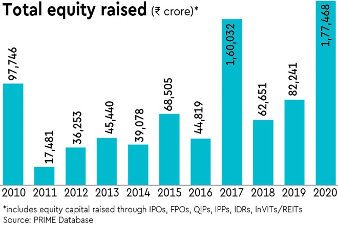 The primary markets have all but eclipsed the stunning rally in the secondary markets in 2020 with companies having raised a whopping Rs 1.77 lakh crore. That’s a 116% increase over last year’s Rs 82,241 crore and topped the Rs 1.6 lakh crore raised in 2017, data from Prime Database show.