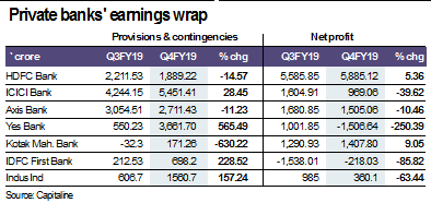 The combined profit of 17 private sector banks, which have so far reported their March quarter earnings, fell by 14.4% quarter on quarter to `10,388.14 crore in the three months ended March from `12,131.79 crore in Q3FY19 amid a sharp 40.7% rise in aggregate provisions.