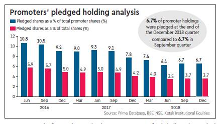 “Outstanding promoters pledged shares were `1.96 lakh crore, which is about 1.47% of the total BSE 500 Index’s market capitalisation in December 2018. Promoters of 116 companies pledged their holdings among BSE 500 Index stocks compared to 114 companies in September 2018 quarter,” said the report.