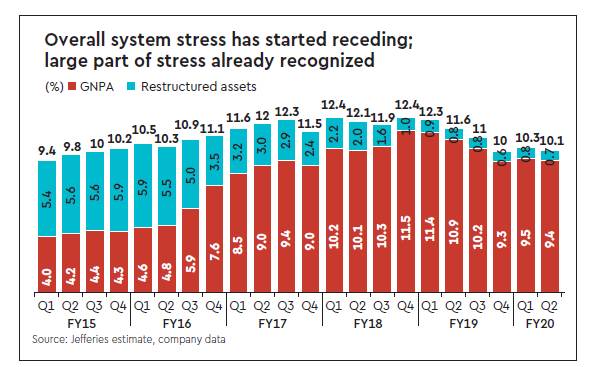 Write-offs & increasing provision coverage drive net stress reduction: Sector stress peaked in FY18 at 12.4%, tapering to 10.1% as of Q2FY20—the reduction mostly the result of write-offs (~Rs 2.2 trn in FY19 & ~Rs 0.8 trn in H1FY20, cumulatively ~28% of opening gross NPL) and increasing provision coverage. Overall, banks have beefed up their PCR from ~50% in FY18 to ~63% in Q2FY20. NPL formation has come off for the sector, though private-sector banks have posted an increase because of liquidity tightness in select sectors/segments.