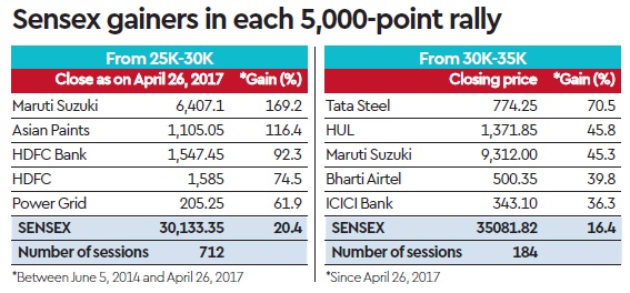 The benchmark Sensex hit yet another milestone on Wednesday, topping the 35,000 mark for the first time in its history. The broader Nifty-50 also closed higher amid expectations of a recovery in corporate earnings and a revival in economic growth. The Sensex rallied another 310.77 points or 0.89% to close the day at 35,081.82, while the Nifty scaled 88.10 points or 0.82% to 10,788.55. The Sensex completed the latest rally of 5,000 points at a faster pace than the earlier two occasions of adding similar gains. It took only 184 sessions to reach the 35,000 mark from 30,000, as against 712 sessions to get from 25,000 to 30,000. It had taken close to nine times more (1,608 sessions) than the recent rally to reach the 25,000 mark in June 2014. Tata Steel was the biggest index gainer since April 26 last year, when the Sensex touched 30,000, rising 70.5% during the period. HUL and Maruti Suzuki gained 45% each during the same period, while Bharti Airtel and ICICI Bank gained 40% and 36%, respectively. Maruti Suzuki was the star performer with a 169% return during the Sensex’s run from 25,000 to 30,000 in April 2017; the stock has generated handsome returns for investors by participating in the last two rallies of 5,000 points, gaining 291% even as the index added 10,000 points.