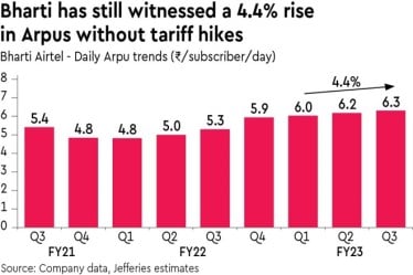 Bharti’s market share gains in 4G subscribers, an increase in average revenue per user, and an improving tariff outlook from the government’s stake in Vodafone Idea Ltd., are the ‘key’ reasons for Jefferie’s ‘buy’ recommendation. That should help Bharti drive 13% growth in its mobile ARPUs over fiscal 2023–25. Market share gains are likely to accelerate amid 5G rollouts. While we cut our estimates by 1-4% to factor tariff hike delays, we upgrade Bharti to Buy as, after a 13% fall since Nov-22, the stock offers 16% upside potential to our rolled forward PT of Rs 900.