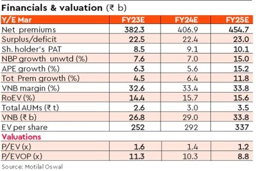 In the first nine months of FY23, APE grew by a muted 4% y-o-y, which may suggest that growth remains slow. Growth in the banca channel has been weak, so IPRU is focusing on other partnerships to offset weak growth in ICICIBC’s banca channel. As a result, the mix of ICICIBC in overall APE moderated to 16.9% in 9MFY23 v/s 48.8% in 9MFY20, while other banca channel’s mix improved to 13.5% v/s 4.4%. We believe that the recovery in premium growth would be key for re-rating as the recent budgetary announcement could further hamper the growth trajectory.