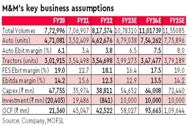 Thus, we are building in 12% tractor volume decline for M&M in FY24 as against our earlier estimate of 6% growth. For SUVs, though waiting period of XUV700 has declined, overall monthly retails in general have largely remained unchanged in the past 4-6 months, as per our dealer interactions. We believe waiting period of XUV700 is down to 2-3 months in general as compared to 6-12 months in H1FY23 due to rise in cancellation rate. For other key models like Scorpio N and Thar rear wheel drive, waiting periods are in excess of a year. With XUV400 and Thar RWD yet to get delivered, against current monthly wholesale number of 30-32k units, we are building in 35k units/month of SUVs in FY24. The FES (farm equipment segment) of M&M has shown a consistent and stable financial performance in the past, with little variation even in the face of changes in sales volume. As a result, it is projecting a 17.5% Ebit margin for this segment in FY2024.