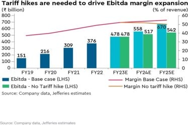 Normalising tariff hike assumptions: While the pace of tariff hikes has disappointed, the government’s recent stake in VIL could drive positive surprises. Over FY23-25, we now expect a single tariff hike of 15% towards end-CY23, resulting in 1-6% cuts to our FY23-25 revenue/Ebitda estimates. Post the cuts, we expect Jio to deliver 15/18% revenue/Ebitda Cagr over FY23-25. We lower our EV for Jio to $80bn.
