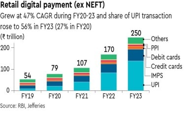 Industry card spending growth healthy, despite UPI growth: Retail digital spending (ex NEFT) grew at a 47% CAGR in FY20-23. Share of UPI in retail digital spending rose to 56% in FY23. Share of credit card spending in retail digital spending is down from 15% in FY18 but has stayed stable at 6% for the past 3 years. Industry card spending grew at a 25% CAGR in FY20-23 and should grow at a 21% CAGR in FY23-26E, in our view.