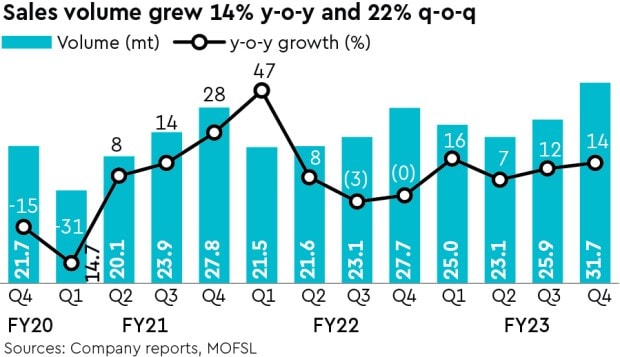 Consolidated revenue/ Ebitda/ PAT stood at Rs 187 bn/Rs 33 bn/ Rs 16.7 bn. Consolidated sales volume grew 14% y-o-y/22% q-o-q to 31.7mt. RMC/white cement revenue grew 34%/22% y-o-y during the quarter. Grey cement realization was up 4.6% y-o-y. In FY23, consolidated revenue grew 20% y-o-y, led by 12%/8% growth in sales volume/realization. However, cost pressures led to 8% y-o-y decline in Ebitda to Rs 106 bn.