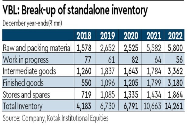 VBL’s 41% volume growth in CY2022 was led by distribution expansion in underpenetrated markets (South/West/East India), stellar growth ‘Sting’ (up 160%+ to 63 mn cases, contributing 9.6% to India volume in CY2022; 16% salience in Q4), and an undisrupted hot summer. The GM decline was restricted to 180 bps y-o-y as 30% inflation in PET was partly offset by early stocking of RM, price increases, better product mix (Sting) and the rationalisation of discounts. Ebitda margin expanded 240 bps y-o-y to 21.2%, aided by operating leverage.