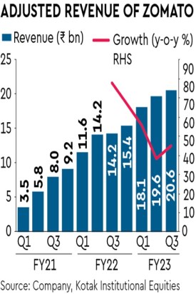 Zomato’s food delivery gross order value (GOV) growth of 21/1% y-o-y/q-o-q was driven by growth in orders (14% y-o-y) and average order value (AOV) (6% y-o-y). Revenue growth of 29% y-o-y outperformed GOV growth of 21% y-o-y due to higher AOVs. We reckon that AOVs have been holding up at Rs 405+ aided by premiumisation and food inflation. Restaurant take-rate of 17.2% in Q3 inched up, but was partially offset by lower customer delivery take-rate of 6.2% (versus 6.7% in Q2). Tepid macro demand led to weaker-than-expected growth of GOV, revenue and MTUs (down 1% q-o-q). Zomato expects restaurant take-rates to inch up further.