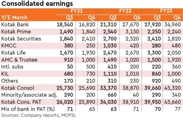 KMB reported a standalone PAT of Rs 35 bn, aided bylower opex and controlled provisions as the bank reversed Covid-relatedprovisions of Rs 130m. Consolidated PAT stood at Rs 45.7 bn. NII grew 35% y-o-y, driven by a loan growth of 3% q-o-q and marginexpansion of 28bp q-o-q to 5.75%. Other income grew 28% y-o-y, aided bycore fee income that rose by a healthy 22% y-o-y. Opex growth was lower supported by lower employee cost even as thebank continued to invest in building a digitally savvy franchise. PPoP grew39% y-o-y, while core PPoP was up 37% y-o-y in Q4FY23.