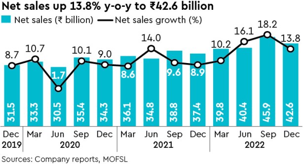 NESTle declared an in-line set of results; however, the tonnage dip in Q4CY22compared to preceding quarters indicate that the high inflation is likely to curb volume growth in the near-term. The company is planning a capex of Rs 5,000 crore over the next three years, which is expected to boost volume growth, especially in prepared dishes (Maggi) and chocolates and confectionary over the medium term. Valuations of 56xCY24 EPS fully capture the stock’s upside potential over the next year. We reiterate our Neutral stance on the stock.