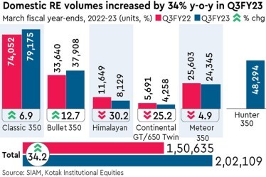 Eicher Motors reported Q3FY23 standalone Ebitda of `860 crore, 3% below our expectations due to weaker-than-expected gross margins and marginally lowerthan-expected ASPs. Revenues increased by 6% q-o-q, led by (i) 7% q-o-q increase in volumes due to strong sales performance of Hunter 350 and (ii) 1% q-o-q decline in ASPs. Decline in ASPs can be attributed to (i) higher mix of Hunter (lower priced product) and (ii) lower exports mix. Ebitda margin came in at 23.9% (+20 bps q-o-q), 50 bps below our expectations. Gross margins improved by 20 bps on a q-o-q basis. The company reported standalone net profit of `680 crore, broadly in line with our expectations due to higher other income.