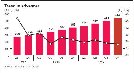 (i) Advances grew 34.9% y-o-y, driven by non-wholesale book, up 49.4% y-o-y, while growth in wholesale book moderated to 25.2% y-o-y. Within non-wholesale book, credit card (up 135.4% y-o-y), MSME (72.8% y-o-y) and LAP (55.1%y-o-y) grew the most; (ii) bank added 340k credit cards during Q4 and reached its target of 1.7 mn cards in FY19 (likely to double this base over 18 months); (iii) NIM improved 11 bps q-o-q to 4.23% due to increase in yield in both wholesale and non-wholesale book on increase in MCLR and change in asset mix; (iv) Fresh slippages were lower at Rs 2.06 bn (2.1% of loans vs. 2.3% in Q3); and (v) increase in GNPLs were primarily from corporate, agri and retail book, while GNPLs in DB&FI and commercial banking book declined sequentially.