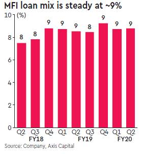 Stressed corporate loans (~Rs 18 bn) have pushed up NPLs and provisions in FY20 and, may continue for another quarter. As the bank passes the hump of these NPL provisioning, we expect a sharp recovery in RoE/RoA. In the near term, we do not see risks to its Bajaj Finance tie-up; expect credit card portfolio to double over the next two years with incremental market share of ~10%. MFI is likely to continue its growth trajectory of 30-35%. With scale, we expect profitability and contribution of these businesses to improve further.