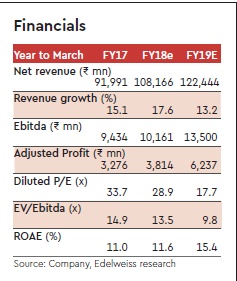 Arvind Fashion: Given the growth plans for brand & retail (B&R) business (22-24% CAGR over FY17–22e), financing future cash flow requirements will be key, as the business posted negative cash flow in past 3 years. Outlook and valuations: We value the stock on SoTP basis (textiles: 7.5x FY19E EV/Ebitda, B&R: 20x FY19E EV/Ebitda) giving us target price of Rs 493. Maintain Buy