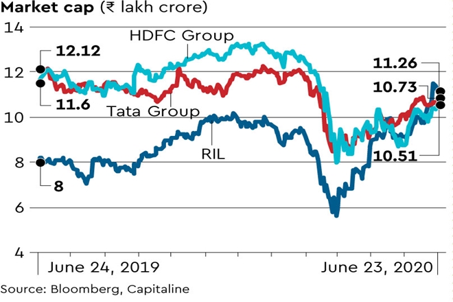 The market capitalisation of Reliance Industries (RIL), at Rs 11.26 lakh crore, has crossed that of the Tata Group and that of the HDFC Group’s four listed companies. Shares of RIL have nearly doubled since March 24, while the prices of HDFC Bank and Tata Consultancy Services (TCS) have risen by 35.1% and 22.4%, respectively.