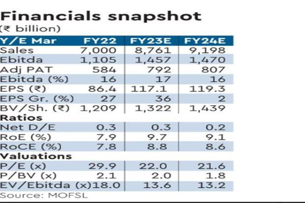 The report showed RIL’s FY22 belonged to the O2C (order to cash) segment performance that outpaced other segments, even as RJio retained its market share. Retail business saw a steady recovery. The high crude prices led to 56% y-o-y Ebitda growth in O2C business while Retail grew 28% y-o-y; RJio growth, however, decelerated to 22% y-o-y. Post-equity raise during the last couple of years, FY22 saw a strong capex with heavy investments, especially in RJio, which included a large-scale spectrum investment. Retail witnessed aggressive footprint additions, while new energy reported aggressive acquisitions. The growth momentum and improved margin profile across the sector will drive RIL’s revenue/Ebitda growth of 25%/32% in FY23E, respectively. Over the next two-to-three years, RIL is likely to create the next engine of growth but it could put pressure on its near-term return ratios.