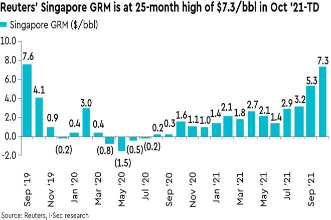 Reliance Industries’ (RIL’s) Q2FY22 EPS was up 43% y-o-y driven by rise in Ebitda across segments and fall in interest cost. Oct’21-TD Singapore GRM is at 25-month high on Chinese refinery utilisation fall, demand rise on switch from gas to liquid fuels, and fall in US and Asian auto fuel inventories. RIL’s GRM lags Singapore GRM, but is at 21-month high. GRM strength is likely to sustain until Mar’22 or even extend to FY23e especially if winter is severe, but there are headwinds, too.
