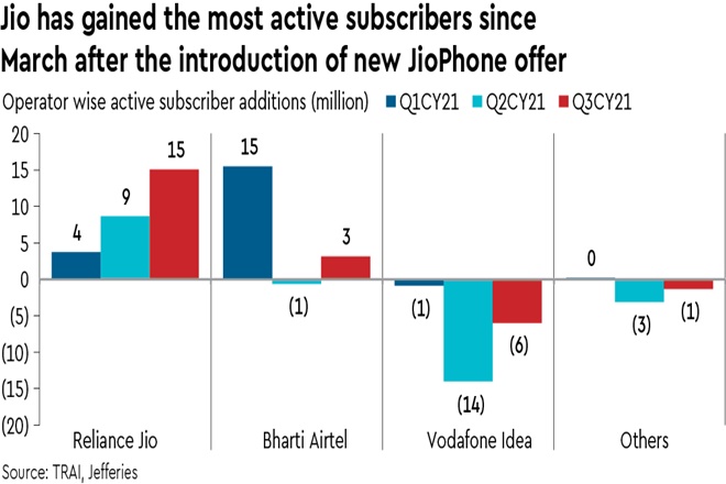Focus on both subscriber additions and ARPUs: Reliance Jio’s tariff hikes have brought its discount back to 13-20% vs. Bharti in the prepaid smartphone segment. Since March-21, Reliance Jio has added 24m active subscribers as against 2m additions for the sector. Given that Jio has not changed these JioPhone plans despite Bharti’s sharp increase in voice tariffs, we believe subscriber traction on JioPhones should remain strong.