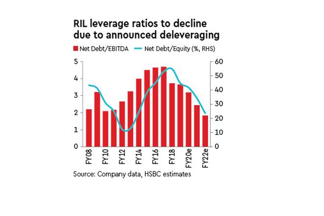 Debate 1: What if progress on RIL’s deleveraging plans slows down amidst rising macro uncertainties? We believe RIL is on a sustained path of deleveraging through: (i) strong operating cash flow generation; (ii) capex discipline; and(iii) selective asset monetisation. RIL is targeting to reach zero net-debt by FY21e; it announced several asset monetisation deals in 2019. In Q3FY20, RIL suggested steady progress towards completion of separate deals with Aramco (energy business), Brookfield (Tower InvIT) and the possibility of strategic investors in Fibre InvIT. Even in a negative case of slow progress on these, $21 bn of FCF over FY21e-23e should help RIL achieve zero net-debt by 2Q23e. RIL’s adjusted net debt of $32 bn appears high; however, its leverage ratios have started to decline, which supports our thesis of sustained deleveraging.