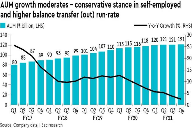 AUM growth moderate as low disbursements and high balance transfer weighs: Disbursements grew by only 6% y-o-y in Q4FY21 thereby exiting FY21 with 30% lower disbursements vis-à-vis FY20. Against the guided monthly disbursement run-rate of Rs 2.2-2.5 bn, Q4FY21 disbursements were marginally lower at Rs 6.4 bn due to Tamil Nadu election impact.