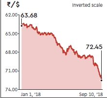 The rupee on Monday crashed to new lows, hitting 72.67 against the dollar in intra-day trade before staging a mild recovery to close at 72.44. The currency has lost nearly 12% since January. The premium on three-month forward contracts jumped 9 basis points on Monday to around 4.52% over Friday’s close. A month ago, on August 10, the premium on the forward contract was at 4.32%.