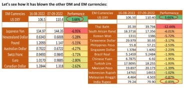 As seen in the above tables, in the past 3 weeks, the DXY has risen by 3.66% whereas, amongst the Developed market currencies, the Japanese Yen is the worst hit with a nearly 7% fall followed by the New Zealand dollar, Pound with over a 5% fall each. The second largest traded currency EUR is also hit by a 2.8%