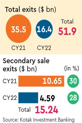 However, the secondary sales nearly halved from $10.65 billion recorded in CY21, while the total exits for the year stood at $35.5 billion.