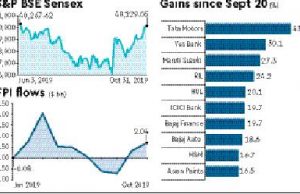 The benchmark clocked gains amid expectations of higher foreign flows into the country after the Federal Open Market Committee (FOMC) cut the policy rate by 25 basis points and expectations of a pick-up in corporate earnings. Market participants believe the rally will continue on account of lower tax rates, divestment of PSUs and improved liquidity conditions. “Favourable conditions like easing taxation norms by the government and a liquidity surplus situation would lead to higher inflows from foreign portfolio investors (FPIs) in the coming months,” said Deven Choksey, MD, KRChoksey Investment Managers.
