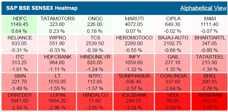 Among the sectoral indices on the Bombay Stock Exchange, the BSE Healthcare index declined the most — 2.57 per cent at 16696.04, it was followed by the BSE Metal index (down 2.31 per cent at 7,116.66) and the BSE Bankex (down 2.1 per cent at 18050.35). Rest all other indices also ended in red.