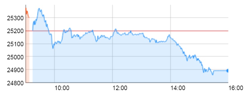 3.30 pm: The BSE Sensex closed 308.09 points down at 24,893.81. The benchmark index opened the day at 25302.98 and touched a high and low of 25,387.32 and 24,851.77.