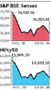 On Friday, the Sensex shed 463.95 points, or 1.3%, to close the session at 34,315.63 while the broader Nifty 50 pared 149.5 points, or 1.4%, to end at 10,303.55. With Friday’s fall, the Nifty 50 has come off more than 12% from its August highs.