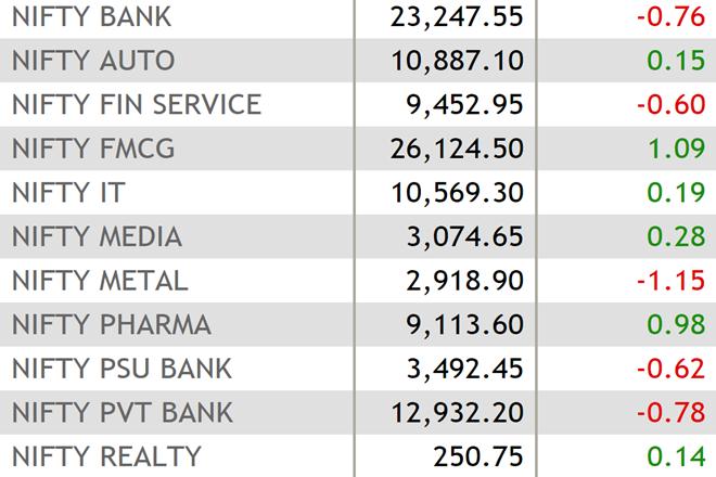 12:51 pm: Sectoral indices of NSE trade mixed with Nifty FMCG (up 1.09%), Nifty Pharma (0.98%) rising the most whereas Nifty Media (up 0.28%), Nifty IT (up 0.19%), Nifty Auto (up 0.15%) and Nifty Realty (up 0.14%) trade with relatively less gains. The benchmarks for banks, financial services and metal witness a drop with Nifty Metal (down 1.15%), Nifty Bank (up 0.76%), Nifty Fin Service (down 0.6%).