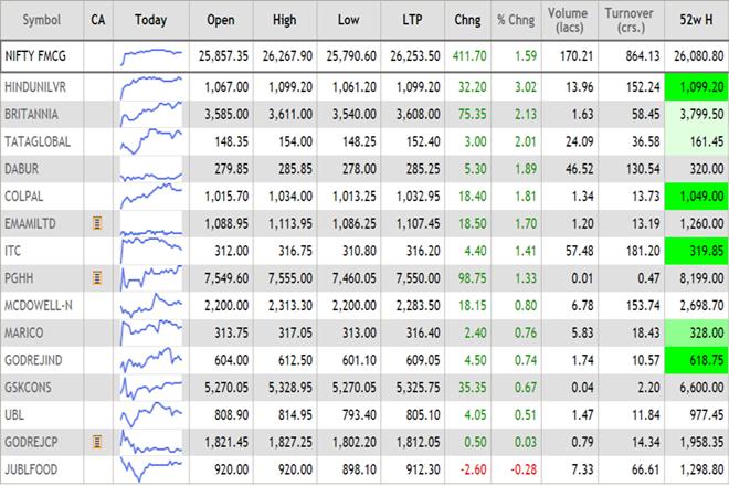 02:25 pm: The shares of FMCG sector soars the most with Hindustan Unilever (up 3.02%) hitting the record high of Rs 1,099.2. While Britannia (up 2.13%), Tata Global Beverages (up 2.01%), Dabur (up 1.89%), Colgate-Palmolive (up 1.81%) lead behind HUL. The Nifty FMCG index too hit a record high at 26,267.9 points, trade up 1.59% at 26,253.5 points.