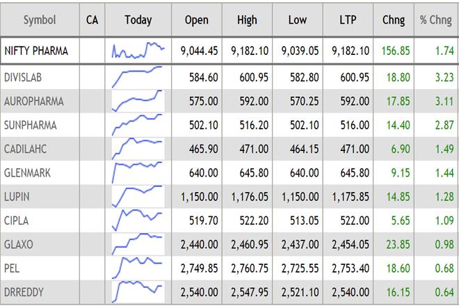 09:30 am: The Nifty Pharma index of NSE rises 1.74% to 9,182.1 points, after a week-long subdued trade in all pharma sector stocks. All the stocks of the index trade in green with the Divi’s Lab (up 3.23%), Aurobindo Pharma (up 3.11%), Sun Pharma (up 2.87%) rising the most. Earlier, last week most of the pharma stocks traded at their near 52-week lows.
