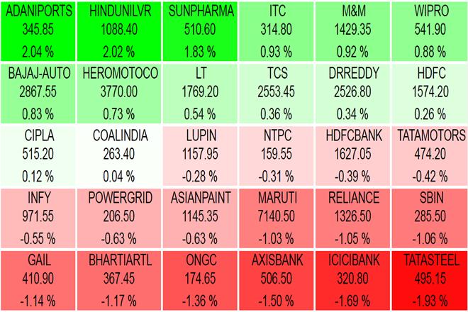 12:30 pm: Domestic markets trade lower in the mid-morning session, the benchmark Sensex down over 70 points at 31,073.25 points. The shares of Adani Ports (up 2.04%), Hindustan Unilever (up 2.02%), Sun Pharma (up 1.83%), ITC (up 0.93%), Mahindra & Mahindra (up 0.92%) lead the index while that of Tata Steel (down 1.93%), ICICI Bank (down 1.69%) and Axis Bank (down 1.5%), ONGC (down 1.36%) and Bharti Airtel (down 1.17%) trade in red.