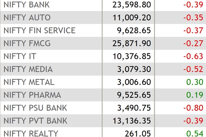 10:43 am: The information technology index of NSE, Nifty IT extend morning losses, down 0.95% at 10.343.15 points followed by the consumer goods index, Nifty FMCG which also trade down 0.62% at 25,780.45 points.
