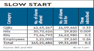The initial public offering (IPO) of Shalby Hospital, which opened on Tuesday, was subscribed 0.2 times, or 20%, with investors bidding for 29.31 lakh shares of the 1.45 crore shares on offer. The qualified institutional buyers bid 14.09 lakh shares on the opening day of the IPO. High Net-worth Individuals (HNIs) bid for 29,820 shares and retail investors bid for 14.62 lakh shares. On Monday, Shalby Hospital Limited raised `150 crore from 11 anchor investors by allotting 60.7 lakh shares. Anchor investors include Goldman Sachs, Citigroup, Reliance Nippon Life Insurance Company, Axis Mutual Fund, IIFL, Nomura, Avendus and SBI Life Insurance Company.