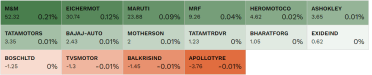 The Nifty Auto was up 0.35%, highest among the sectoral index. Big constituents like Eicher Motors, M&M, Maruti Suzuki, MRF were pulling the indices higher, while Apollo Tyre along with other stocks was trying to drag it.