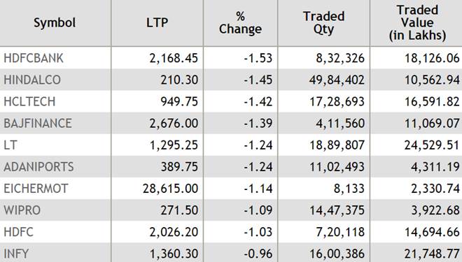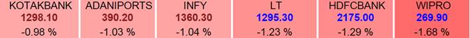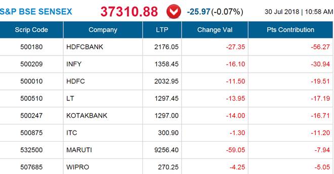 The heavyweight shares of Infosys, HDFC Bank, Kotak Mahindra Bank, L&T were the major contributors in wiping out the gains from the benchmark Sensex and Nifty indices in the late morning trades on Monday. On a collective basis, these four shares washed off 119 points from BSE Sensex.