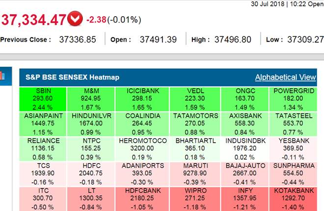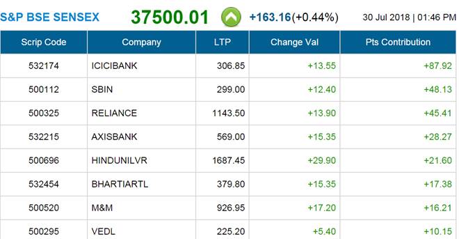 Sensex crossed 37,500 for the first time in the afternoon deals on Monday led by a sharp uptick in share prices of ICICI Bank, RIL and SBI. Indian shares recovered partly in the mid-morning session extending losses in the late morning session on weaker global cues and uncertainty over RBI’s repo rate outcome and US Fed meeting. BSE Sensex slipped more than 200 points from the all-time high after falling in negative territory following the downtick in HDFC Bank, Infosys shares in the wee hours of trading today.