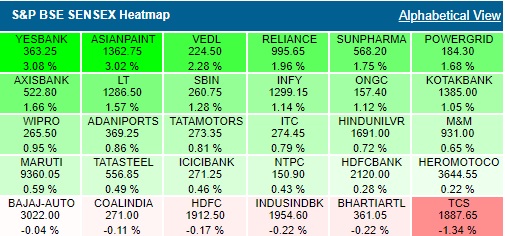 The Sensex of the BSE closed Monday's trade higher by 276.86 points or 0.78% at 35934.72 points after surging almost 319 points during afternoon deals. The Nifty of the National Stock Exchange closed at 10,852.90 points, up 80.25 points or 0.74%. Fresh buying in index heavyweights, along with positive global cues and strong rupee, pushed the key indices of the domestic equity markets higher. Vedanta, Asian Paints, Yes Bank, Sun Pharma, Reliance Industries, Axis Bank, Power Grid, LT, SBI, Infosys, ONGC, Kotak Bank shares all closed with gains of over 1% on the Sensex.