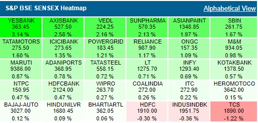 Gains in blue-chip shares of Vedanta, Axis Bank, Yes Bank, Sun Pharma, Tata Motors, Asian Paints, ICICI Bank, Tata Steel, Reliance Industries and M&M sent the Sensex soaring by 273 points to an intra-day high of 35931.09 points during late-morning trade deals on Monday. On the National stock exchange, the Nifty traded firm above the 10,800-mark and rose by 72 points to a high of 10,844.70 points during intra-day trade. Vedanta, Dr Reddy's Lab, Axis Bank, Sun Pharma, Yes Bank, Tata Motors, Hindalco, HCL Technologies were the top gainers on the National Stock Exchange.