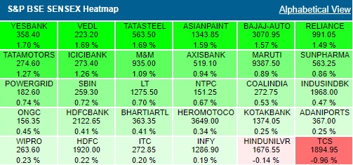 The Sensex of the BSE closed Monday’s trade higher by 276.86 points or 0.78% at 35,934.72 points after surging almost 319 points during afternoon deals. The Nifty of the National Stock Exchange closed at 10,852.90 points, up 80.25 points or 0.74%. Fresh buying in index heavyweights, along with positive global cues, pushed the key indices of the domestic equity markets higher. Vedanta, Asian Paints, Yes Bank, Sun Pharma, Reliance Industries, Axis Bank, Power Grid, LT, SBI, Infosys, ONGC, Kotak Bank shares all closed with gains of over 1% on the Sensex.