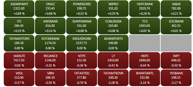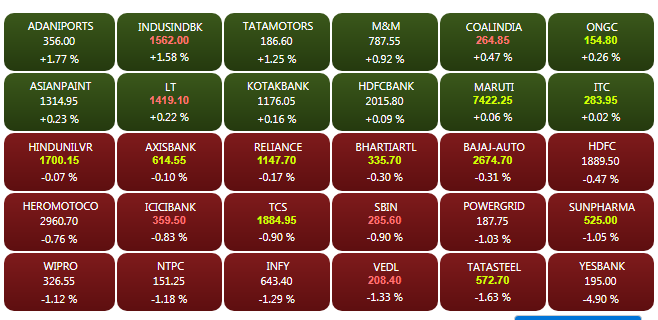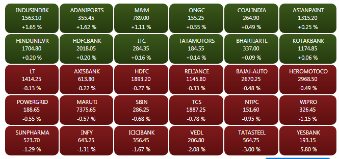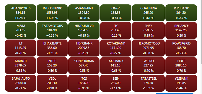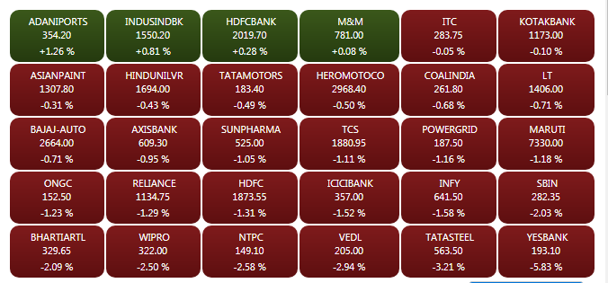 Sensex and Nifty extended losses in the late morning trade on Tuesday tracking weak global cues. After opening lower, the 30-share Sensex is down about 160 points to 35,623.63, while the Nifty 50 is nearing the psychological 10,700-mark. Shares of private sector lender Yes Bank emerged as the biggest loser in the Sensex this afternoon, followed by Tata Steel. A look at the heat map.