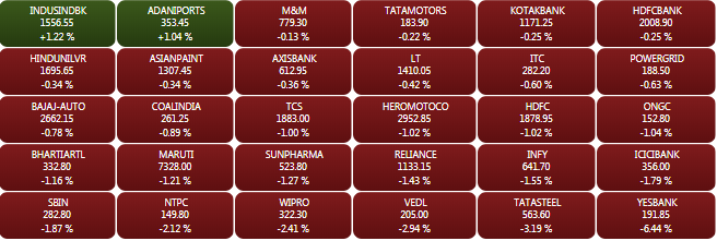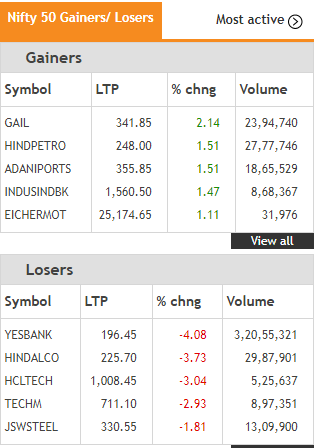 The Nifty 50 is down about 47 points to 10,715 currenlty. Eicher Motors, IndusInd Bank shares are among the top 5 Nifty gainers currenlty. Among the top Nifty losers, Yes Bank and Hindalco have lost up to 5%. A look at top 5 gainers and losers.