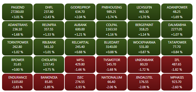 The BSE Midcap Index recovered from day's lows on the back of a rally in the Page Industries, DHFL. Page Industries share price gained as much as 3.1% to hit the days high at 27,350. The BSE Midcap Index is currently trading at 15,036. A look at the BSE Midcap Index heat map.