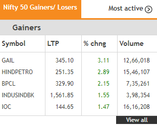 Oil majors GAIL, HPCL and BPCL gained on Tuesday morning, as global crude oil prices fell. The shares emerged among the top 5 gainers in the Nifty. GAIL share price gained more than 3.3% to hit the day's high at Rs 346. Hindustan Petroleum shares zoomed 3.3% to hit intra-day high of Rs 252. BPCL shares gained 2% to Rs 329.95 on NSE, while IOC shares gained more than 1.5% to Rs 144.9. We take a look at top 5 gainers in the Nifty pack.