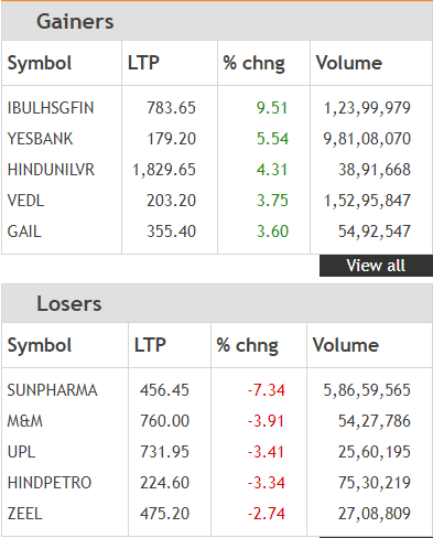 The NSE Nifty was just shy of the 10,900 mark and closed 7 points or 0.06% up at 10,883.75 points. Indiabulls Housing Finance was the top Nifty gainer, up over 9%, while Sun Pharma was the top drag, down 7%. Check top 5 Nifty gainers and losers here.